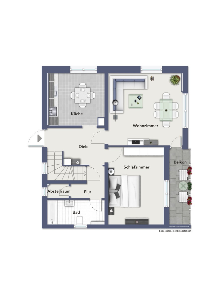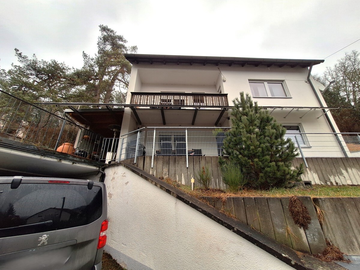 Durch die Hanglage befindet sich der Hauseingang im Obergeschoss. Hier sind der Eingangsbereich, die Küche, das Wohn- und das Schlafzimmer. Vom Wohnzimmer aus kommt man auf den Süd-Balkon. Zusätzlich gibt es hier noch ein Tageslichtbad mit Badewanne und Fenster sowie ein separates WC mit Fenster.