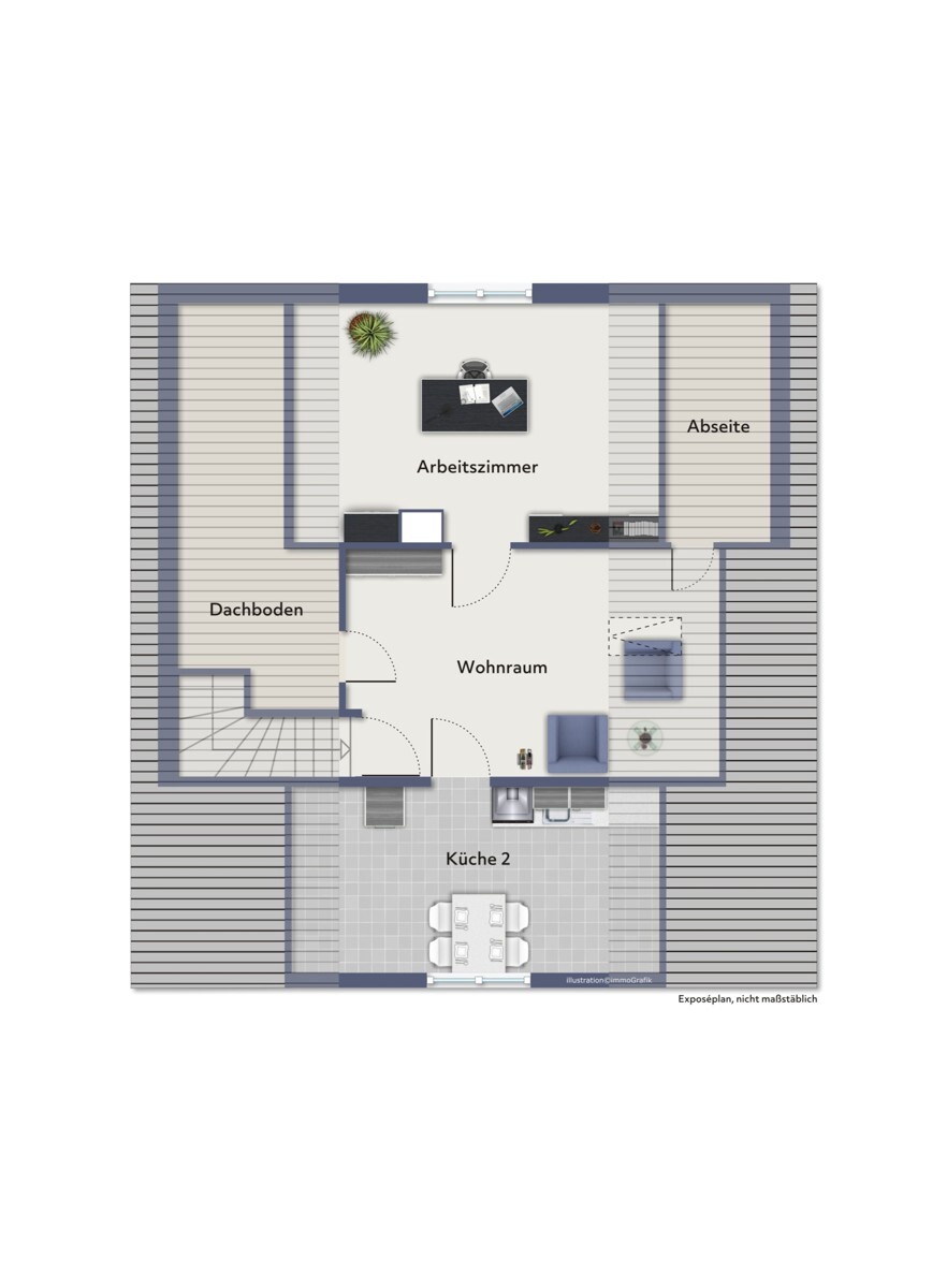 Über die Treppe gelangt man in das Dachgeschoss. Hier gibt es zwei weitere Zimmer, die derzeit als Küche mit Essbereich sowie als Arbeitszimmer und als Wohnzimmer genutzt werden.