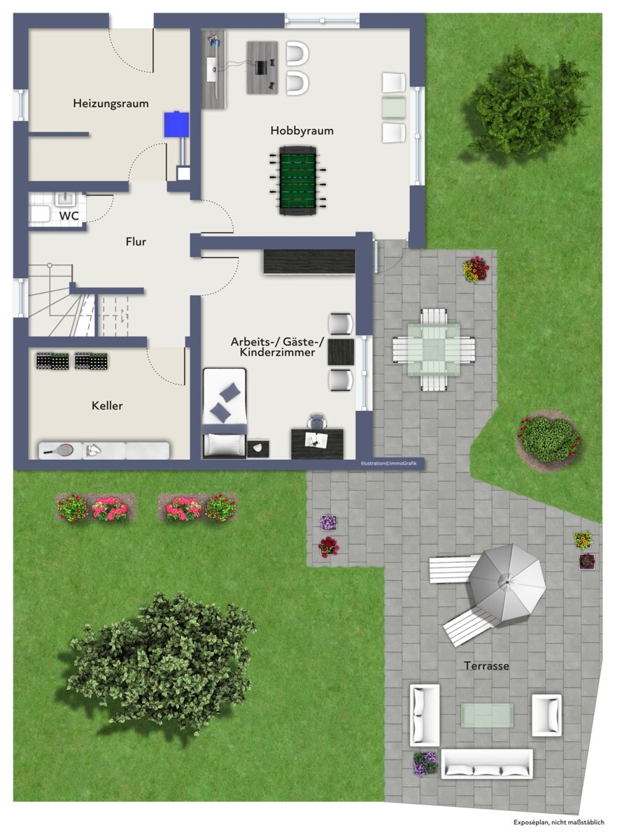 Im eigentlichen Erdgeschoss befinden sich hangseitig der Keller sowie die Waschküche mit der Ölzentralheizung (2011) und einer Dusche im Heizungsraum sowie einem separaten WC. Zusätzlich gibt es hier zwei weitere Wohnräume. Von dem größeren Zimmer kommt man auch auf die großzügige Süd-Terrasse. Beide Zimmer können als Arbeits-, Gäste- oder auch als Kinderzimmer genutzt werden.