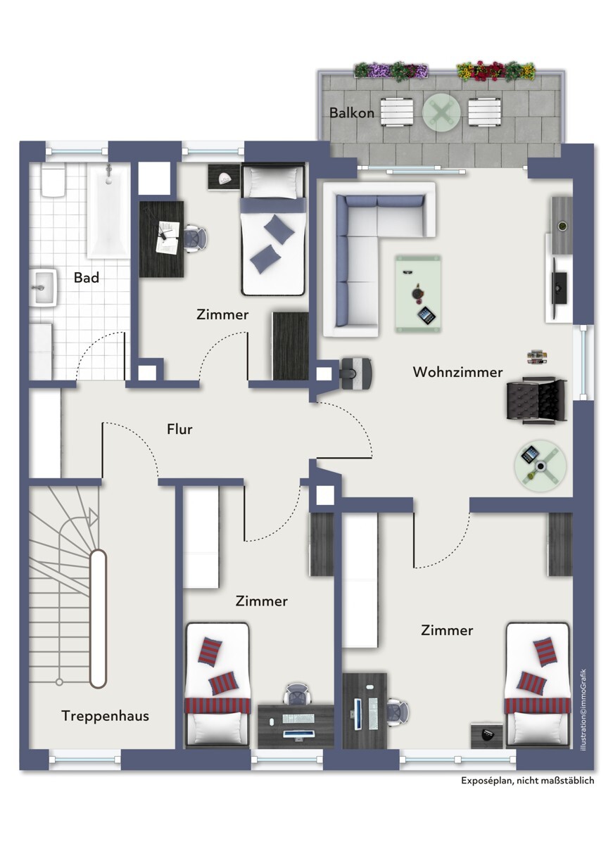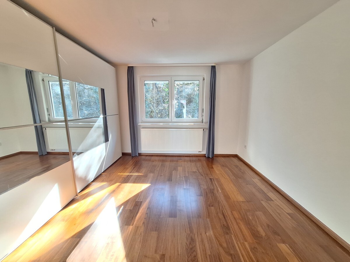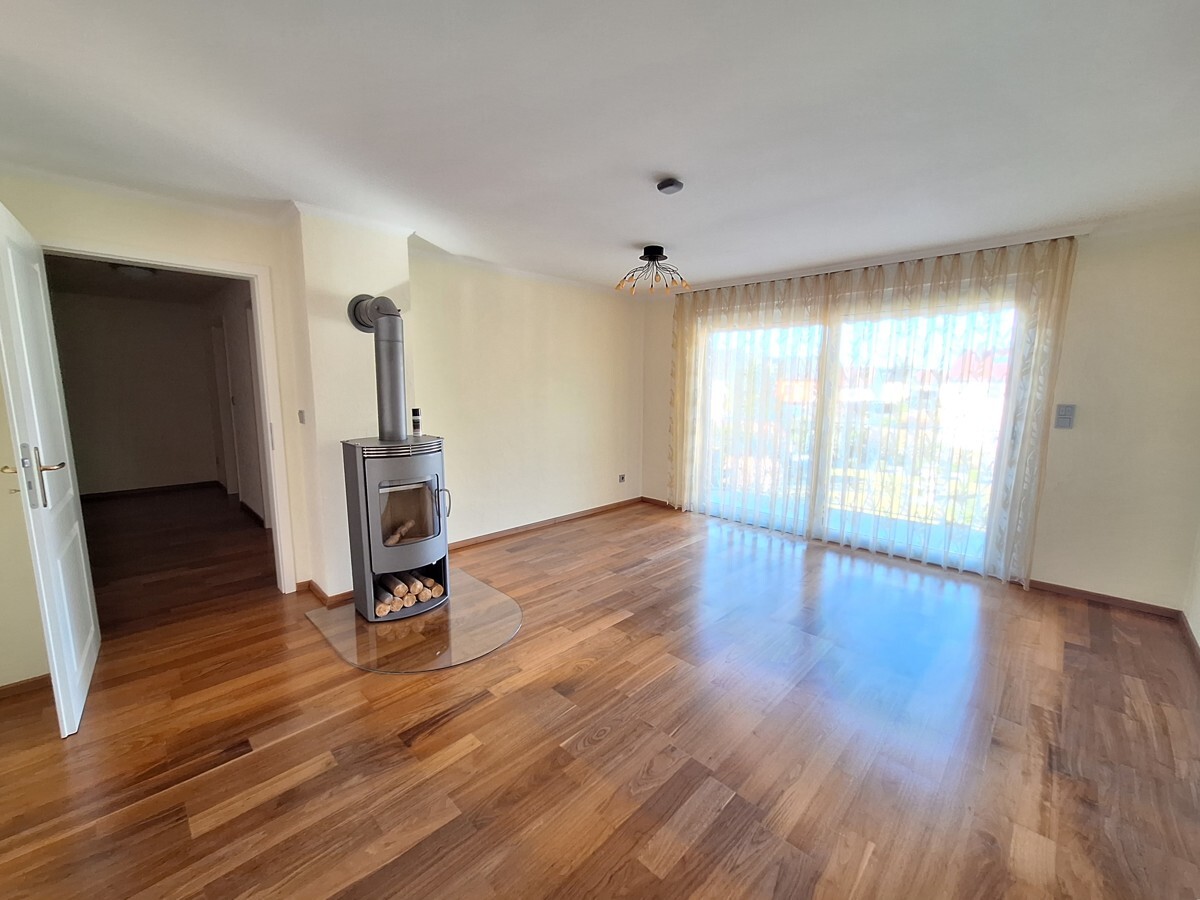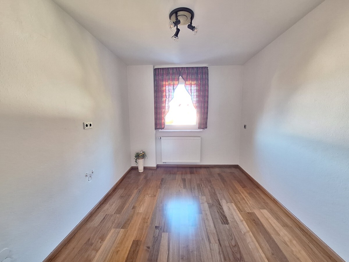 Das Obergeschoss bietet ein Badezimmer mit Badewanne, ein großes Schlafzimmer sowie zwei weitere Zimmer, die sich ideal als Arbeits-, Gäste-, oder Kinderzimmer eignen. Ein weiteres Wohnzimmer mit Schwedenofen und Balkon sorgt für zusätzlichen Wohnkomfort. Alle Räume sind über einen zentralen Flur verbunden. Die Böden in diesem Stockwerk bestehen aus Laminat, während das Badezimmer hell gefliest ist.