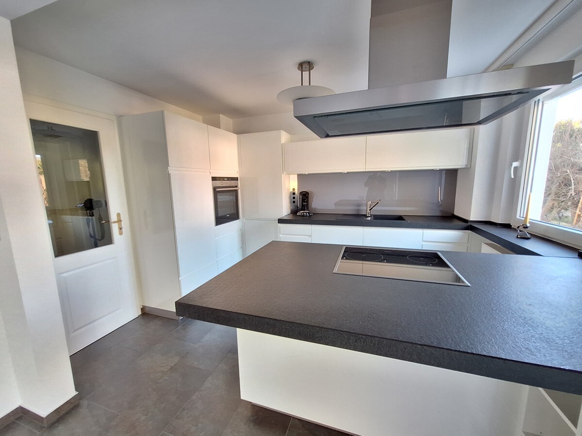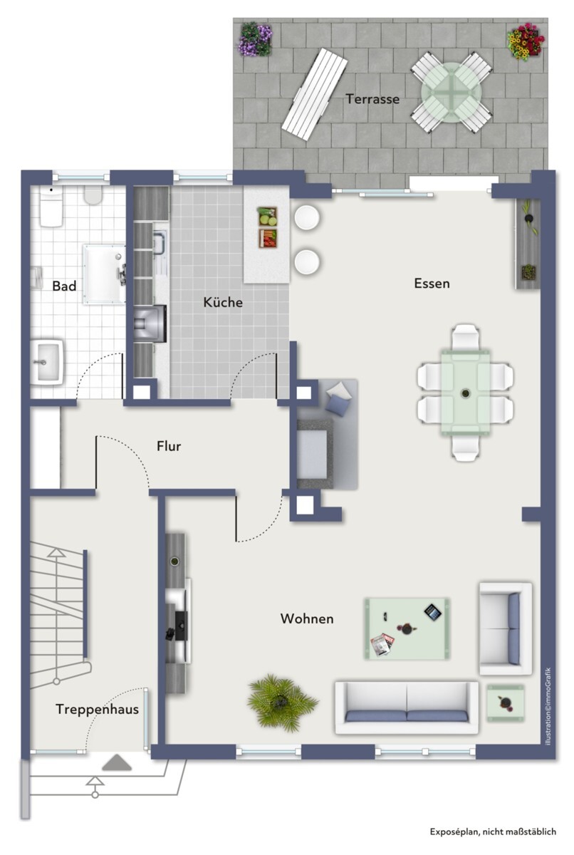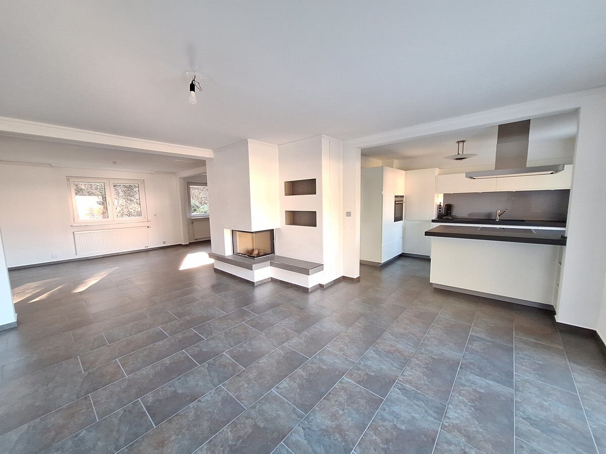 Das Erdgeschoss überzeugt durch eine durchdachte Raumaufteilung. Der Eingangsbereich führt ins Treppenhaus, von dort gelangt man über eine Tür in den zentralen Flur. Hier befindet sich ein modernes Duschbad mit Waschbecken, Dusche, WC und Bidet. Die geräumige Küche ist offen mit dem Wohn- und Essbereich verbunden, in dessen Mittelpunkt ein Kamin für eine behagliche Atmosphäre sorgt. Von hier aus gelangt man direkt auf die großzügige Terrasse mit Westausrichtung. Der Boden im Erdgeschoss ist mit modernen, anthrazitfarbenen Fliesen ausgestattet.