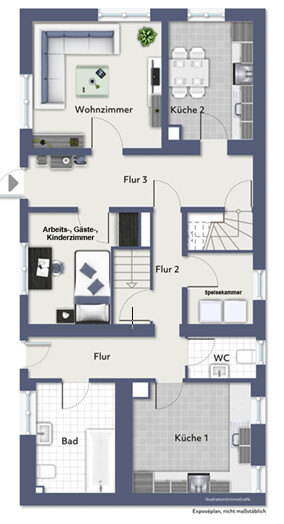 Das Erdgeschoss ist überwiegend gefliest. Im Dachgeschoss ist ein Teppichboden verlegt. Der Spitzboden kann über eine Auszugstreppe begangen und als zusätzlicher Abstellraum genutzt werden.
