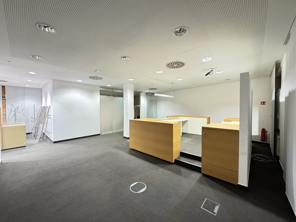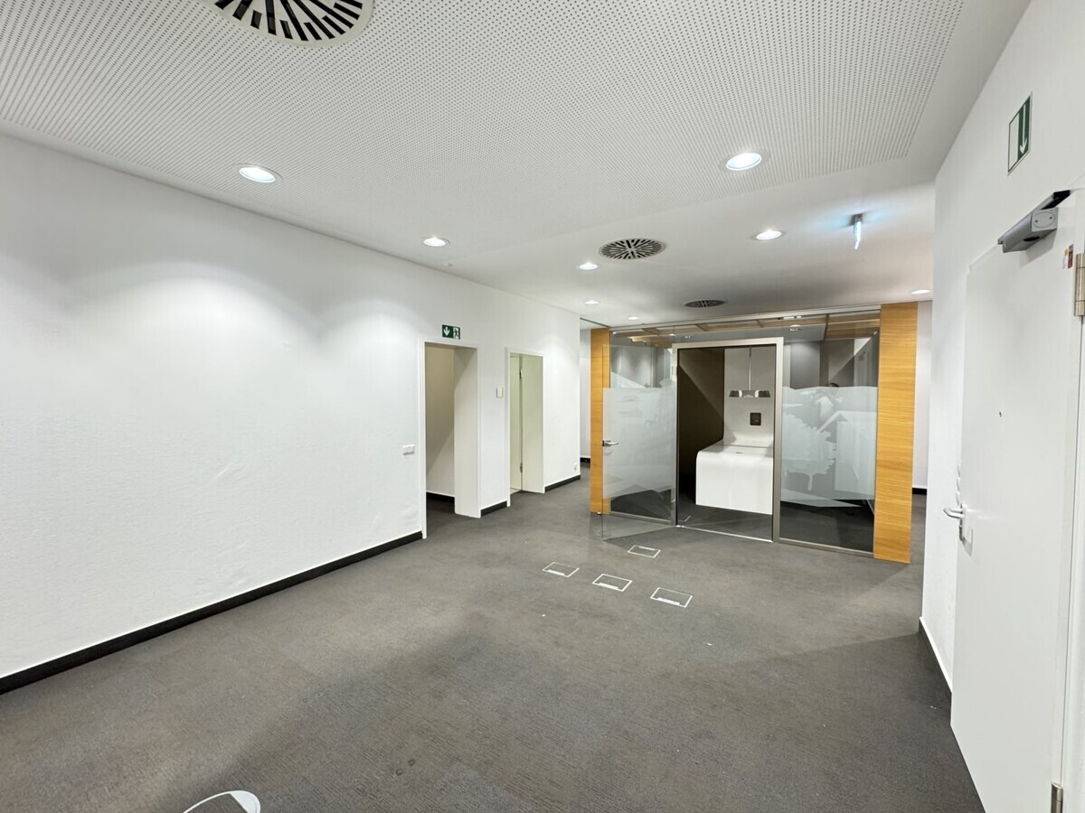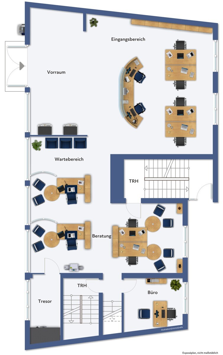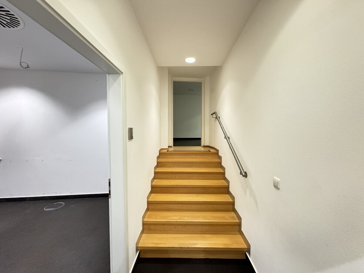 Im angrenzenden Beratungsraum können vertrauliche Gespräche oder Kundentermine professionell durchgeführt werden. Ein separates Büro im hinteren Bereich sowie ein Tresorraum bieten zusätzlichen Stauraum für sensible Unterlagen oder Wertsachen. Zwei Treppenhäuser sorgen für eine komfortable Verbindung zu den anderen Etagen.