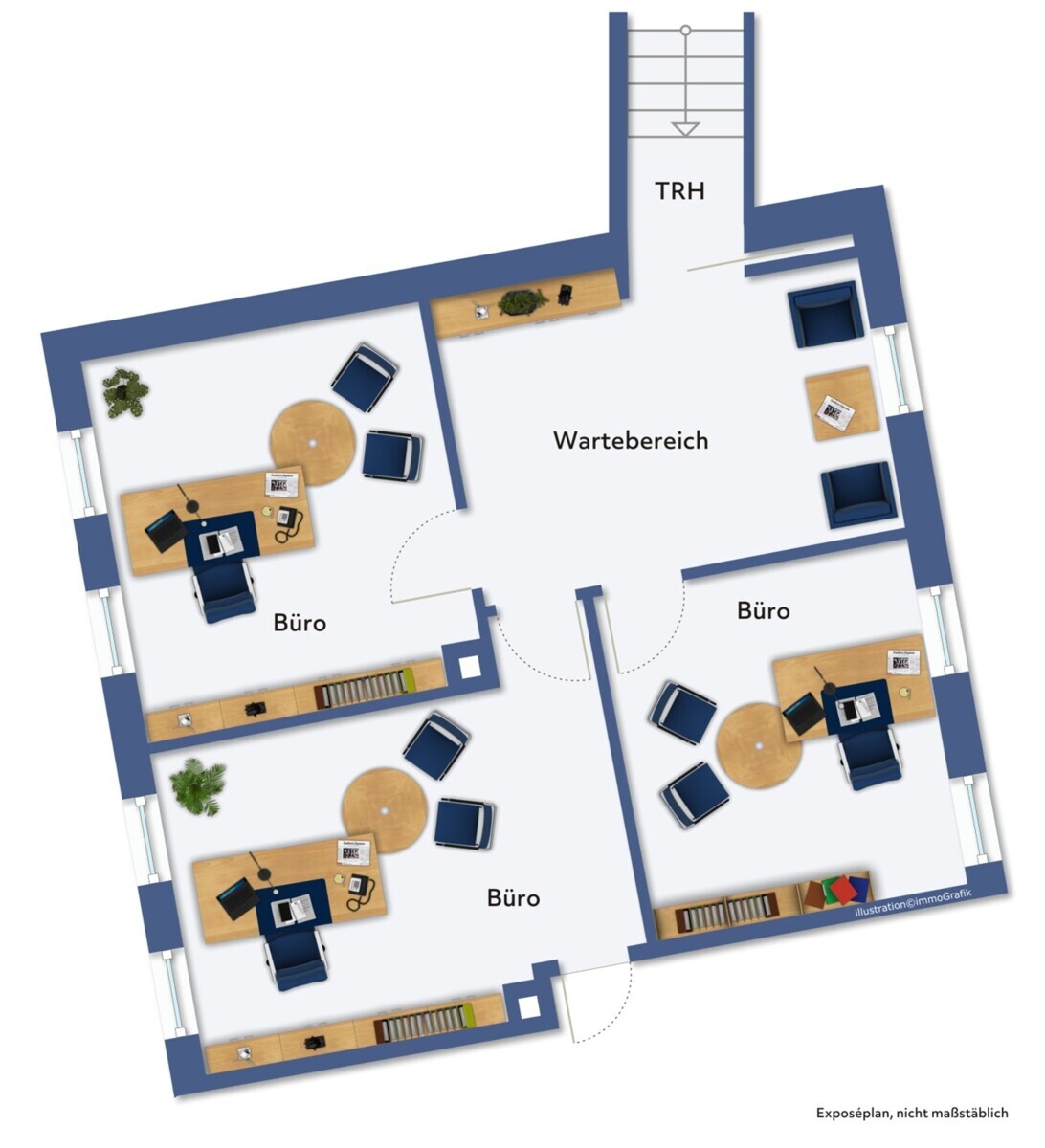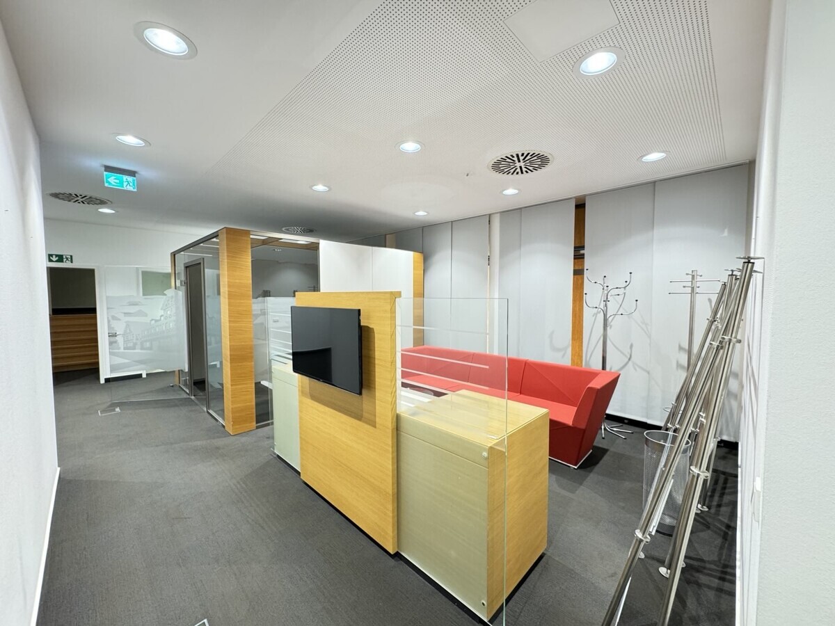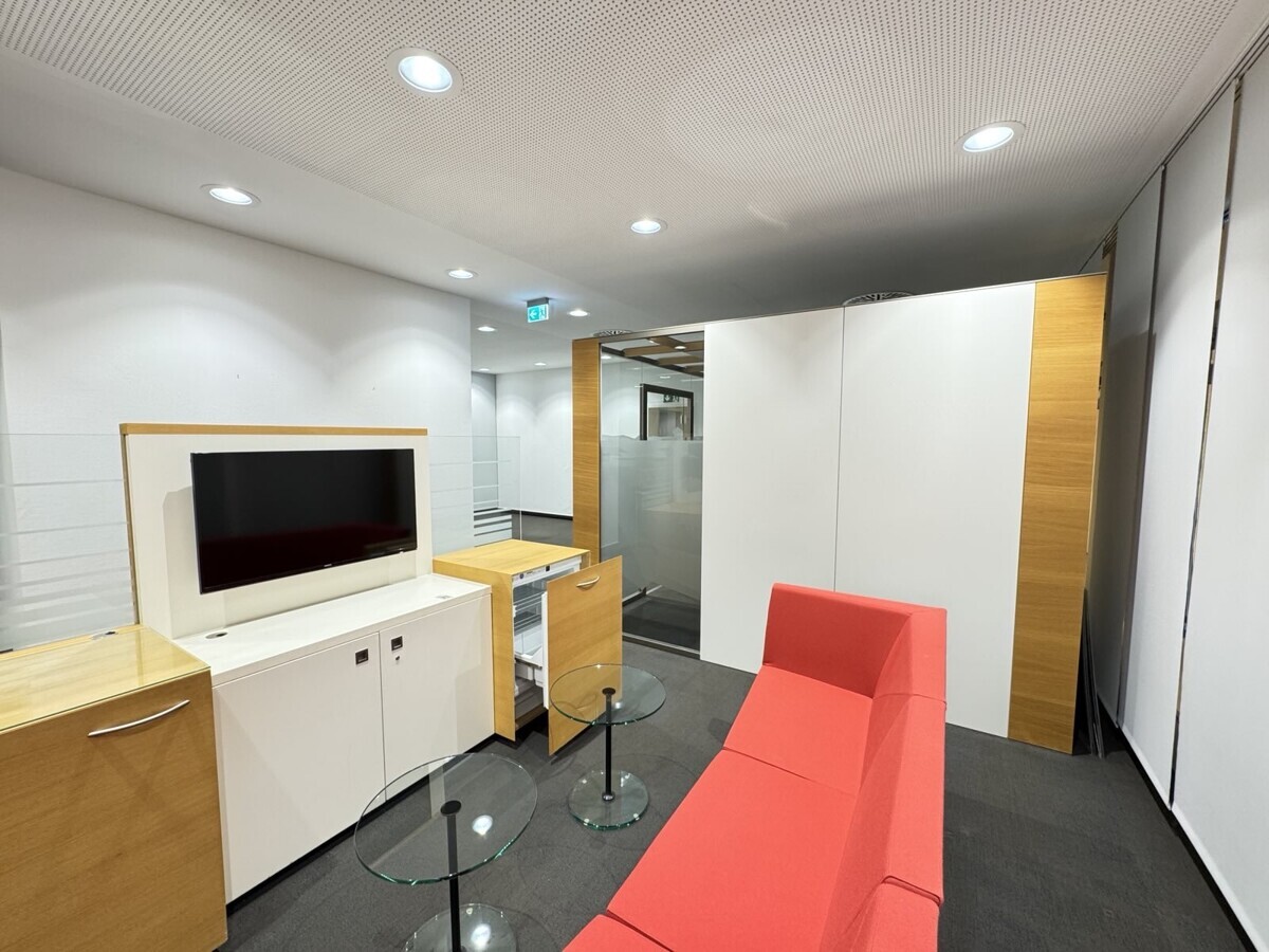 Im angrenzenden Beratungsraum können vertrauliche Gespräche oder Kundentermine professionell durchgeführt werden. Ein separates Büro im hinteren Bereich sowie ein Tresorraum bieten zusätzlichen Stauraum für sensible Unterlagen oder Wertsachen. Zwei Treppenhäuser sorgen für eine komfortable Verbindung zu den anderen Etagen.