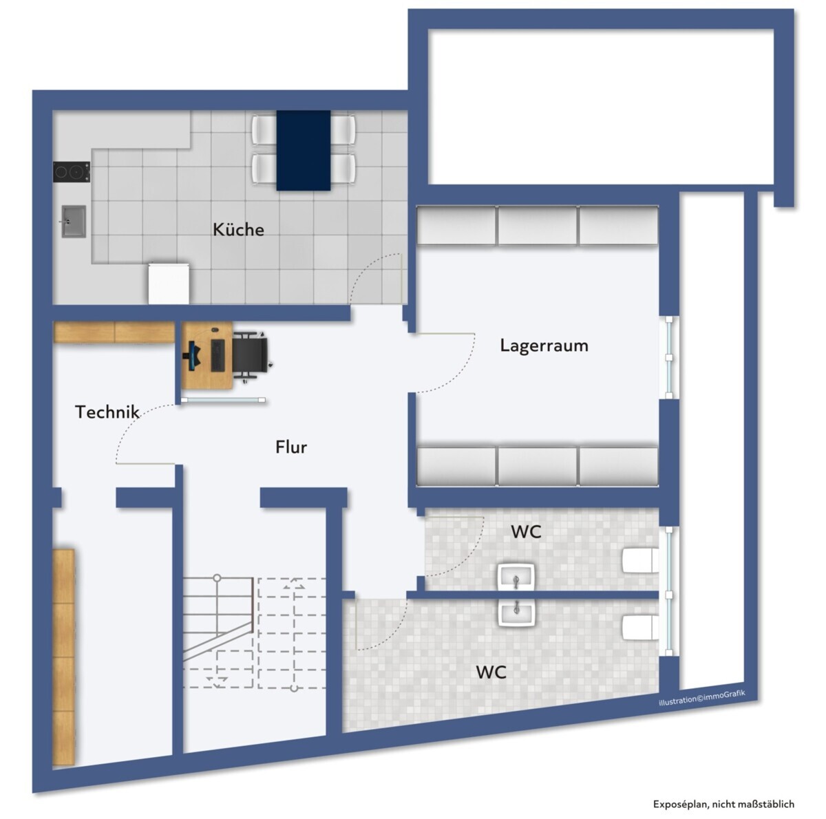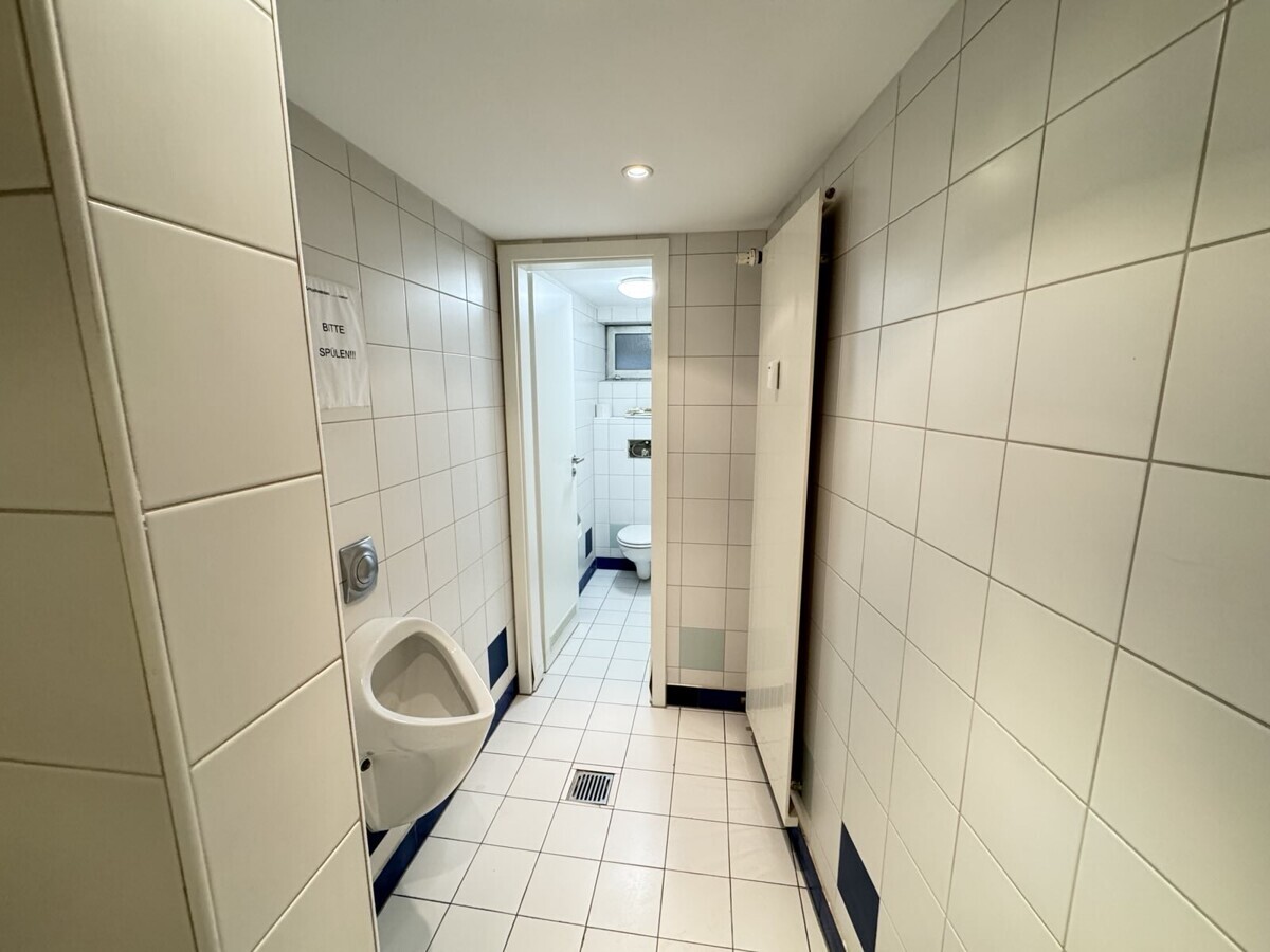 Das Untergeschoss ist ideal für Personal- oder Lagerräume. Eine Küche steht als Aufenthaltsraum zur Verfügung, und ein geräumiger Lagerraum bietet Platz für Materialien oder Waren. Zwei getrennte WC-Bereiche mit Waschbecken und Toiletten sowie ein Technikraum und ein zentraler Flur runden das Angebot auf dieser Etage ab.