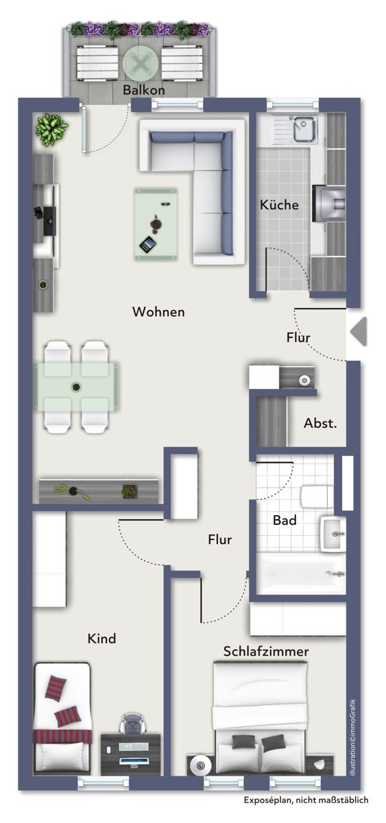 Das geräumige Schlafzimmer und auch das Arbeits-, Kinder- oder Gästezimmer bieten ausreichend Platz für individuelle Gestaltungsmöglichkeiten. Das Wohnzimmer mit Zugang zum Balkon bietet Ihnen in West-Ausrichtung einen Blick in den ruhigen Innenhof.