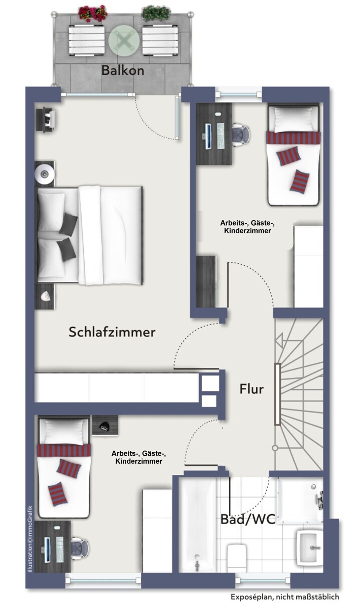Im Obergeschoss befinden sich drei Zimmer. Ein Schlafzimmer mit sonnigem West-Balkon sowie zwei Gäste-, Arbeits- oder Kinderzimmer. Zusätzlich gibt es im Obergeschoss ein Tageslichtbad mit Badewanne, Dusche, WC und Waschbecken.