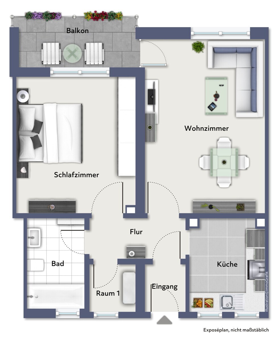 Das Wohnzimmer bildet das Herzstück der Wohnung. Es bietet eine großzügige Stellfläche für Wohn- und Essmöbel. Von hier aus betreten Sie den nach Süden ausgerichteten Balkon, der sonnige Stunden im Freien ermöglicht und zum Verweilen einlädt.