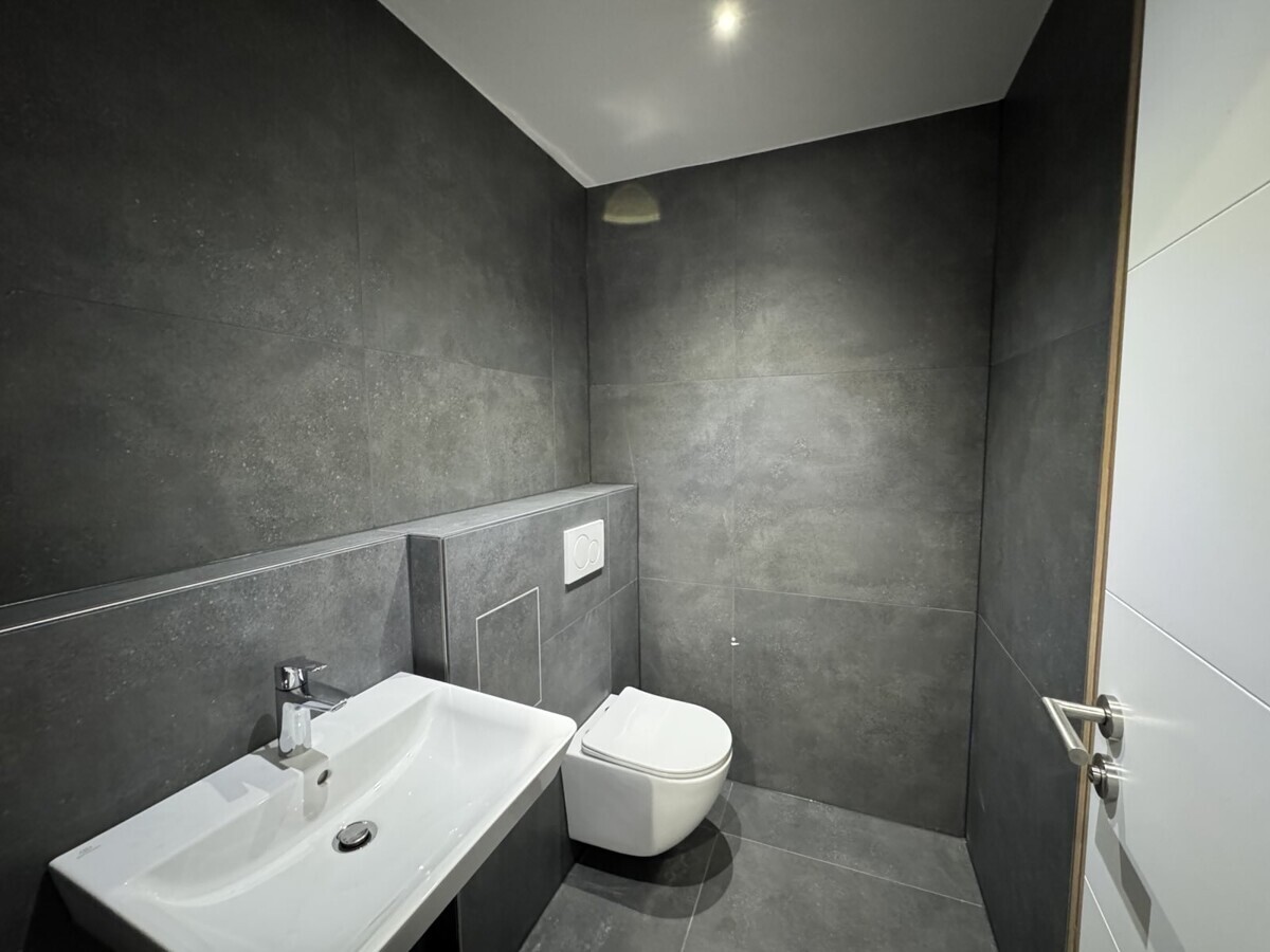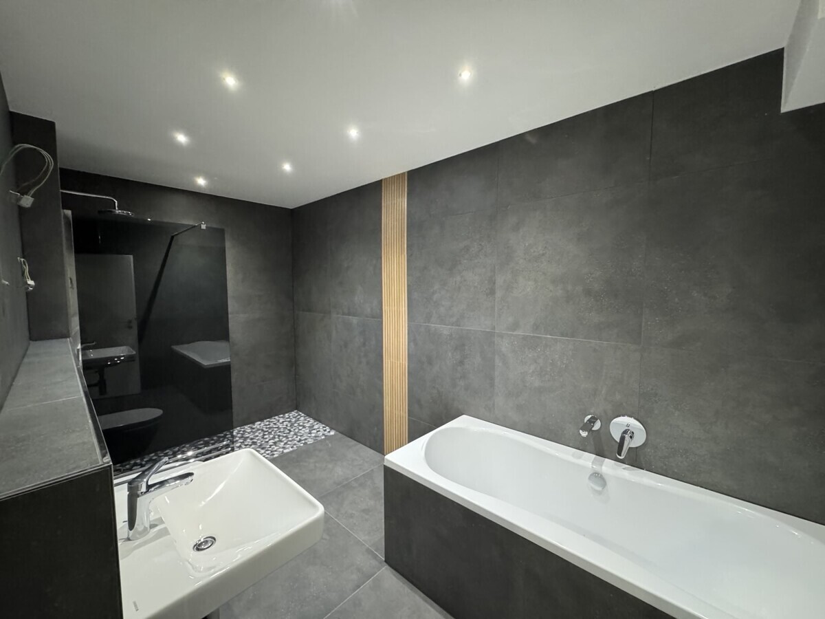 Das angrenzende Schlafzimmer verfügt über eine eigene Ankleide. Über den Flur ist das hochwertig ausgestattete Tageslichtbad mit bodentiefer Dusche, Badewanne und modernen Sanitärelementen erreichbar. Ein zusätzliches Zimmer eignet sich ideal als Kinder-, Arbeits- oder Gästezimmer. Abgerundet wird das Raumangebot auf dieser Ebene durch ein separates Gäste-WC sowie einen Flurbereich, in dem eine Garderobe Platz findet.