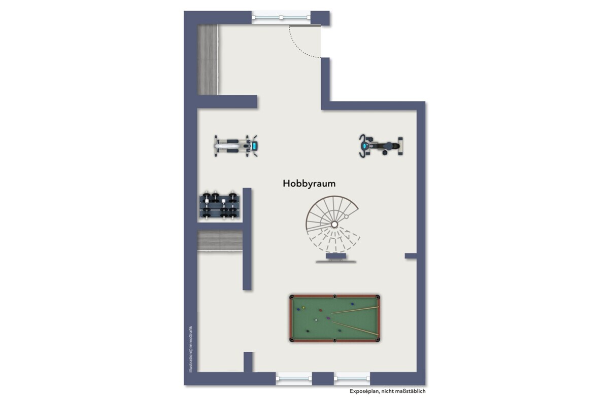 Eine Besonderheit hier ist: Ein großzügiger Hobbyraum im Souterrain, der direkt über eine Wendeltreppe erreichbar ist.
