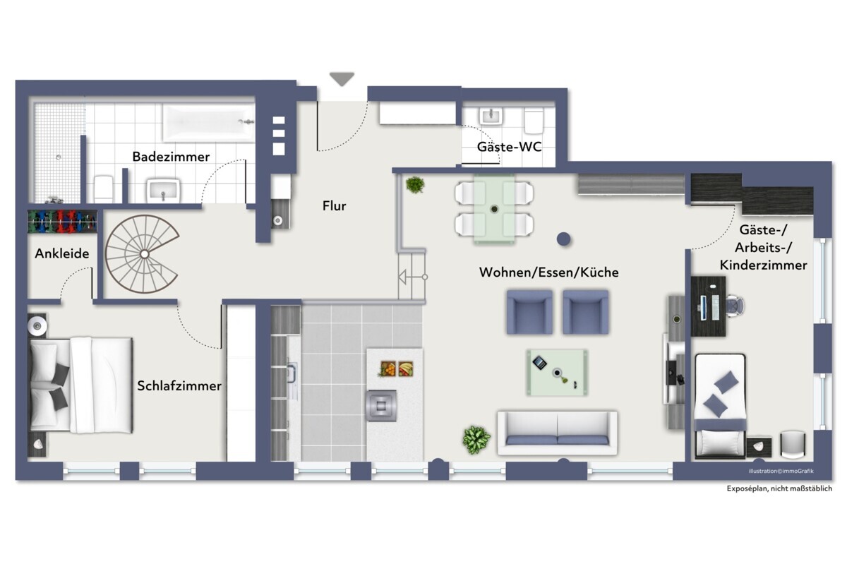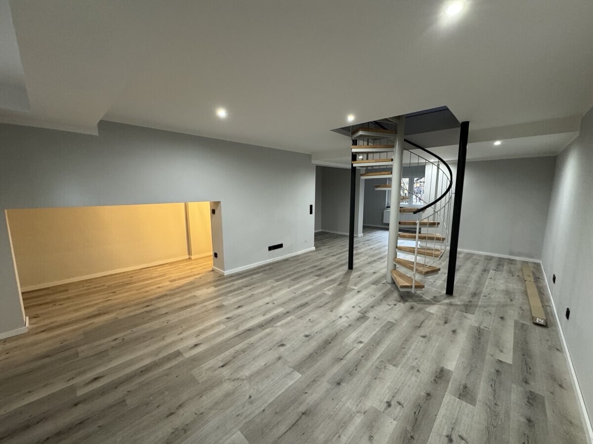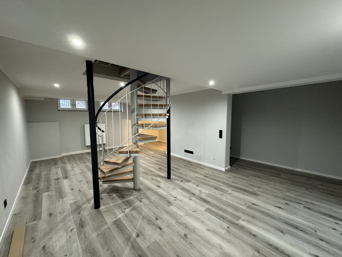 Ein besonderes Highlight stellt der wohnungseigene Hobbyraum im Souterrain dar. Dieser ist über eine stilvolle Wendeltreppe direkt vom Wohnbereich aus zugänglich und verfügt über ausreichend Tageslicht.