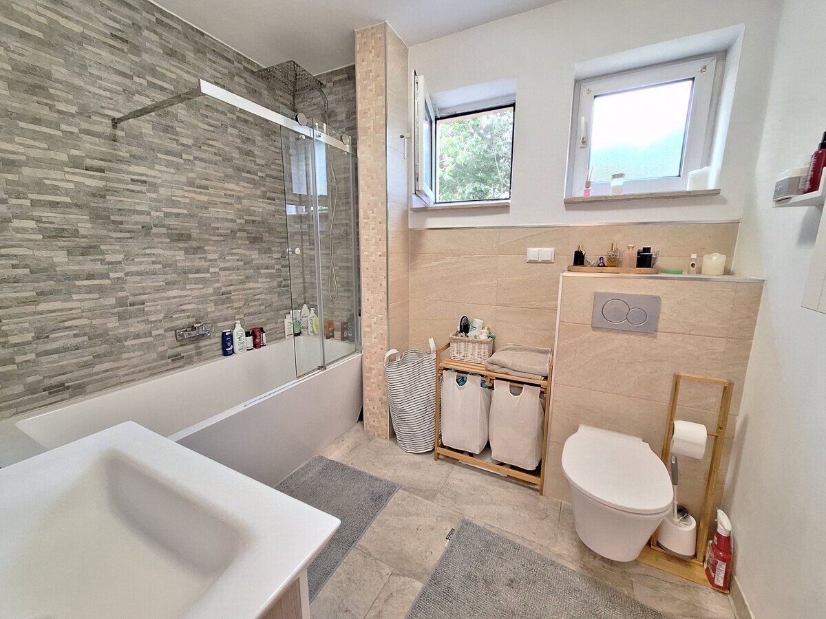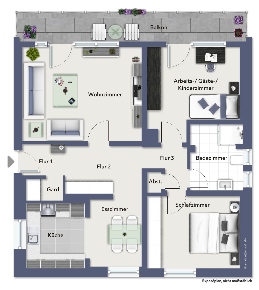 Im hinteren Bereich befinden sich das Schlafzimmer und ein Kinder-, Arbeits- oder Gästezimmer. Das gut geschnittene Tageslichtbadezimmer ist mit Badewanne, WC und Waschtisch ausgestattet. In der Wohnung gibt es neben der Garderobe im Eingangsbereich auch einen praktischen Abstellraum.