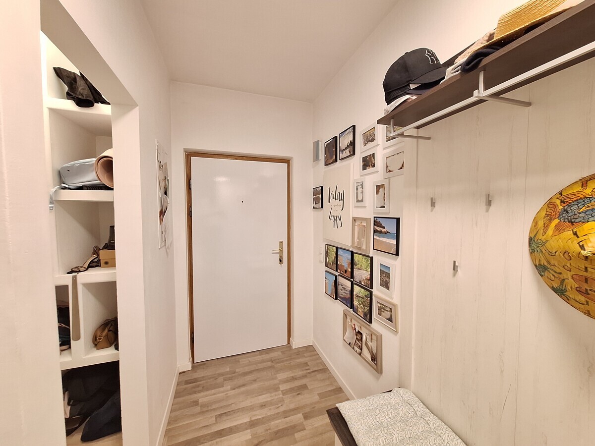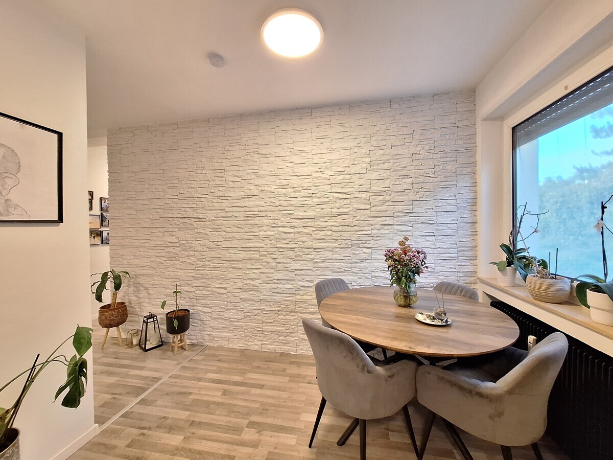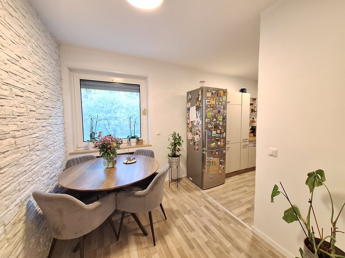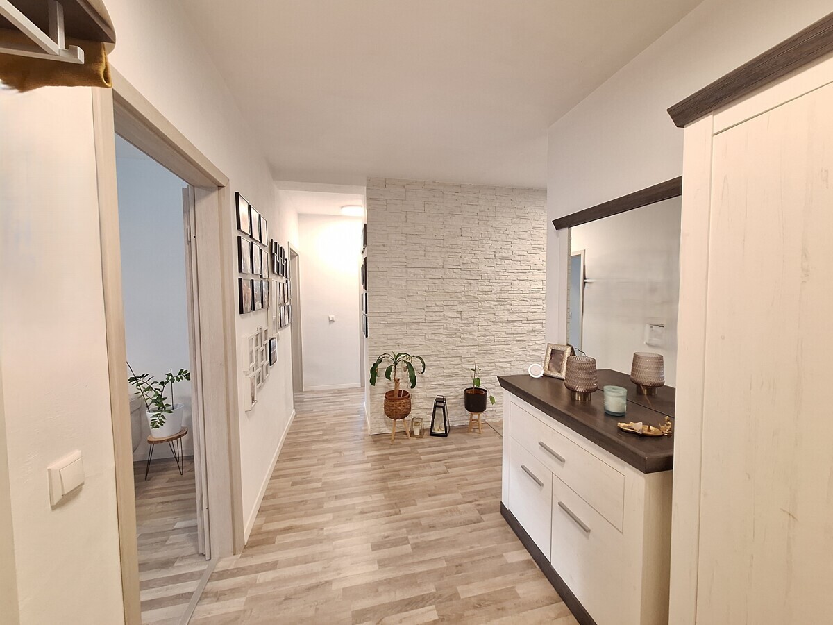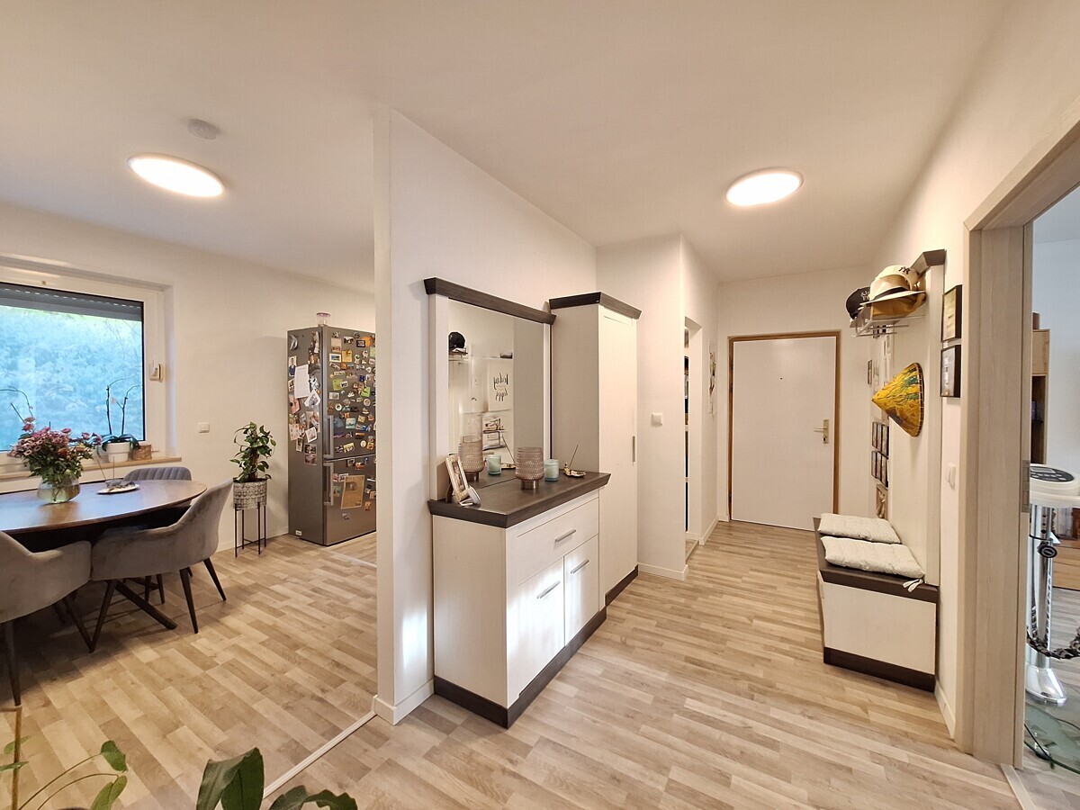 Der Eingangsbereich ist schön und offen gestaltet. Hier befindet sich auch eine Garderobe. Vom Flur aus kommt man zum offenen Essbereich, worüber man die schöne Küche betreten kann.