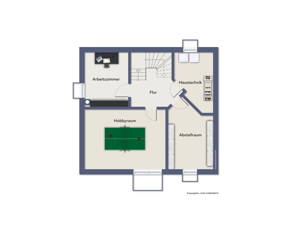 Im Kellergeschoss befinden sich neben dem Technikraum ein geräumiger Hobbyraum, ein separates Arbeitszimmer sowie ein Abstellraum. Diese Etage erweitert das Platzangebot des Hauses auf ideale Weise und kann sowohl als Homeoffice, Fitness- oder Freizeitbereich genutzt werden.