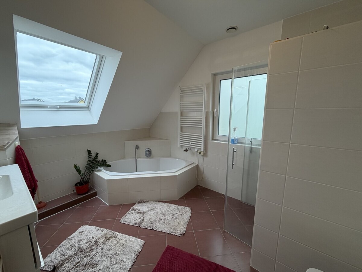 Das Obergeschoss, welches Sie über eine hochwertige Holztreppe erreichen, beeindruckt durch seine gelungene Raumaufteilung. Das großzügige Schlafzimmer verfügt über einen separaten Ankleidebereich. Ein weiteres Zimmer steht als Kinder-, Gäste- oder Arbeitszimmer zur Verfügung. Das moderne Tageslichtbadezimmer ist mit einer Badewanne, einer Dusche, einem Waschbecken sowie einem WC ausgestattet.