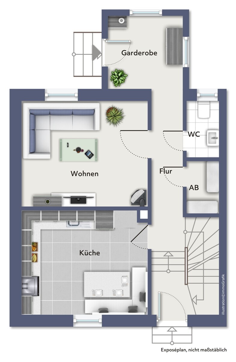 Neben den klassischen Wohn- und Schlafräumen verfügt das Haus über ein kleines Bürozimmer, ein Gäste-WC sowie praktische Kellerräume, darunter ein Waschraum mit Dusche.