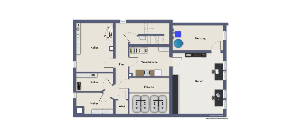 Mehrere großzügige Kellerräume bieten vielfältige Nutzungsmöglichkeiten. Zusätzlich gibt es eine Waschküche, einen Heizungsraum und einen Öl-Tankraum. Viel Platz für Hobby, Werkstatt oder Vorräte.