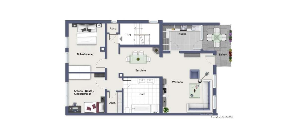 Großzügiger Wohn- und Essbereich mit direktem Zugang zur Terrasse und zur gepflegten Gartenanlage. Im Wohnzimmer sorgt ein Kaminofen für gemütliche Stunden und Wohlbefinden an kühleren Tagen. Die separate Küche bietet ausreichend Platz zum gemeinsamen Kochen. Das Schlaf- und Arbeits-, Gäste-, Kinderzimmer schaffen Rückzugs- und Lebensbereiche. Das lichtdurchflutete Tageslichtbad überzeugt mit moderner Ausstattung. Zudem stehen zwei Abstellräume für zusätzlichen Stauraum bereit. Von der Terrasse führt der Zugang direkt in den großzügigen Garten, der zum Verweilen im Freien einlädt. Eine harmonische Wohnung in ruhiger, gepflegter Umgebung ideal für lichtdurchflutetes Wohnen mit funktionaler Raumtrennung.