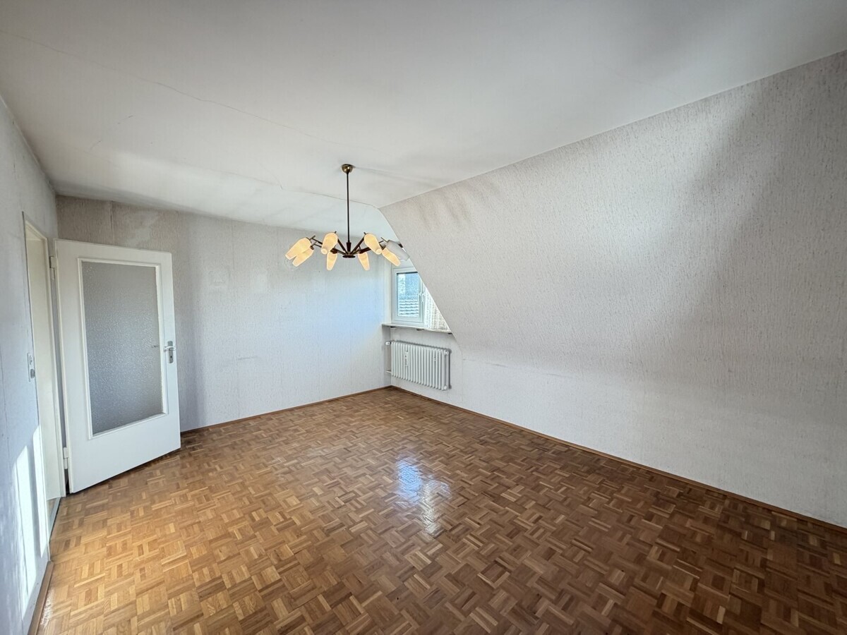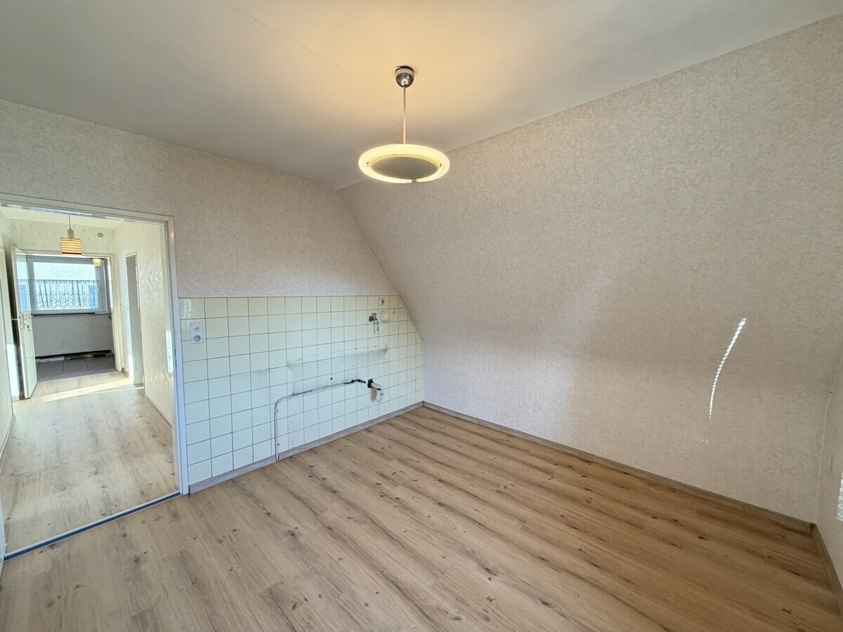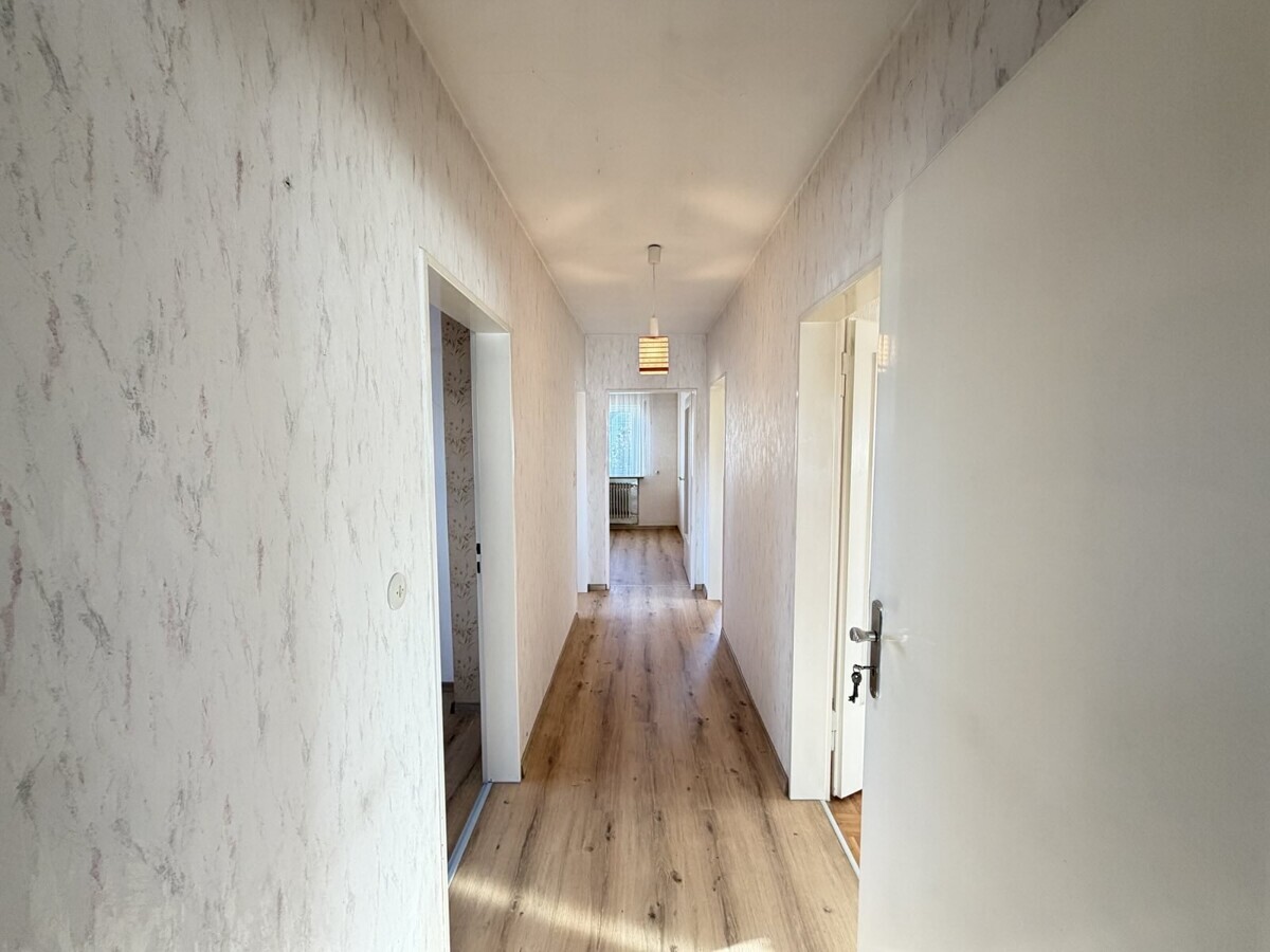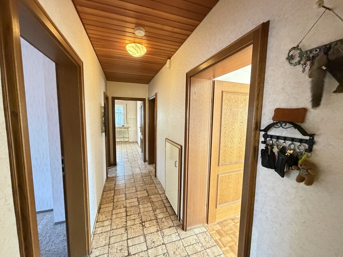 Die Wohnung im Obergeschoss ist ähnlich geschnitten und bietet ebenfalls eine gut nutzbare Raumaufteilung. Hier ist ein Arbeits-, Gäste-, Kinderzimmer, Schlafzimmer, Wohnzimmer, Badezimmer und eine separate Küche vorhanden. Hier wurde gerade neuer Boden verlegt.