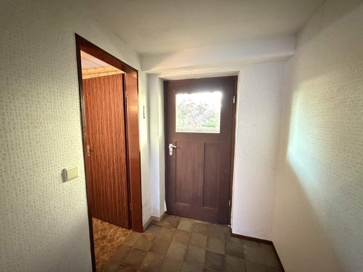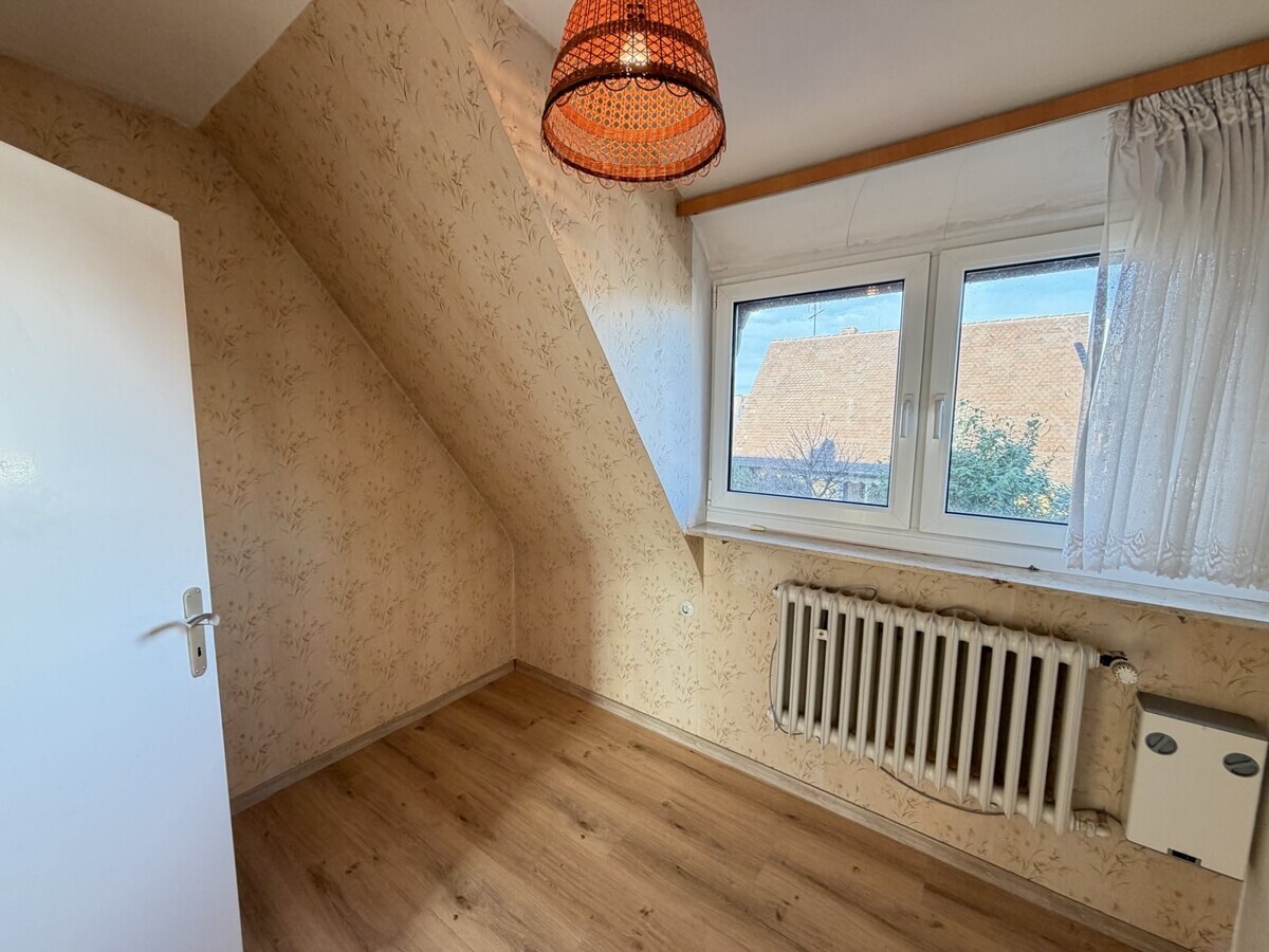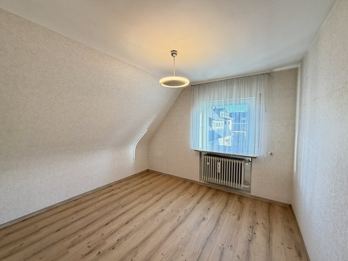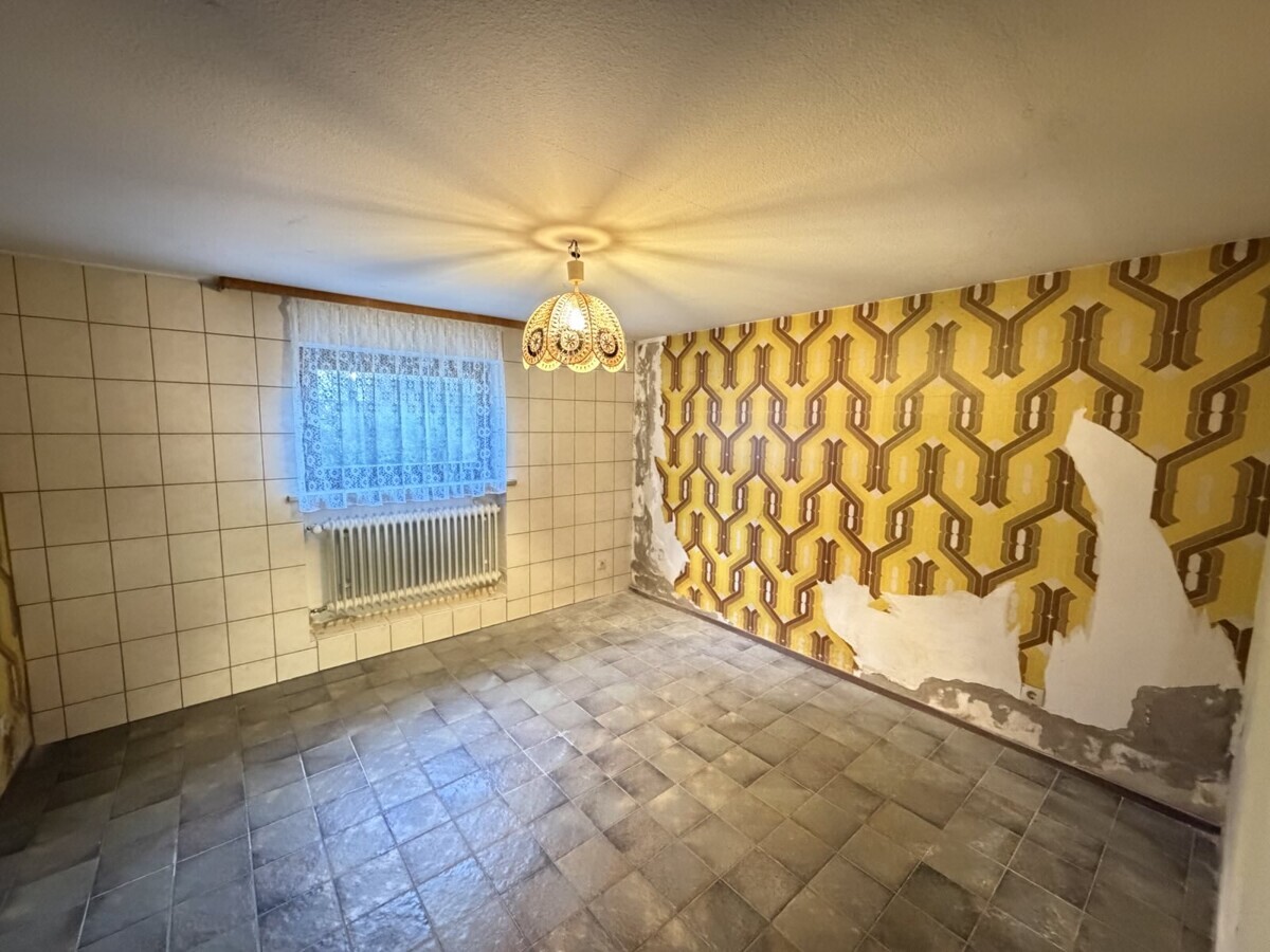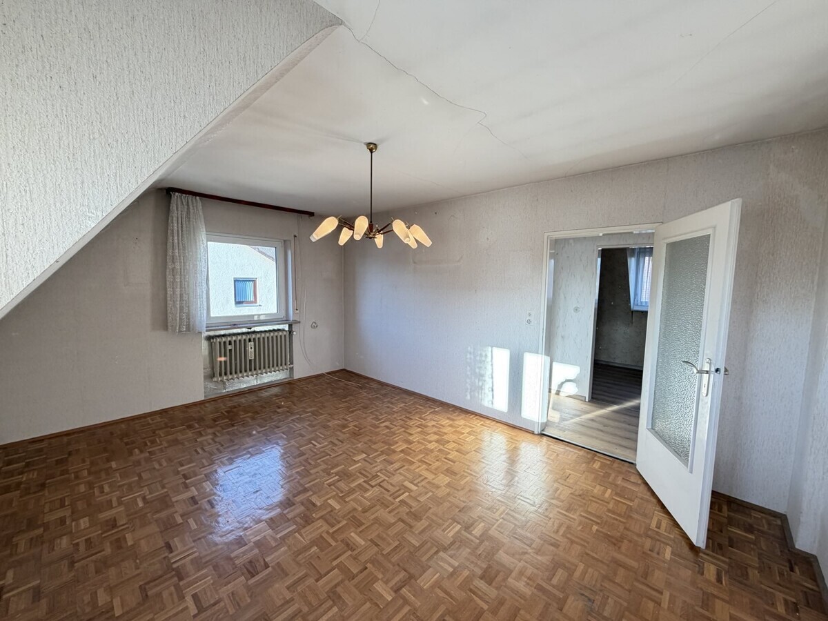 Die Wohnung im Obergeschoss ist ähnlich geschnitten und bietet ebenfalls eine gut nutzbare Raumaufteilung. Hier ist ein Arbeits-, Gäste-, Kinderzimmer, Schlafzimmer, Wohnzimmer, Badezimmer und eine separate Küche vorhanden. Hier wurde gerade neuer Boden verlegt.