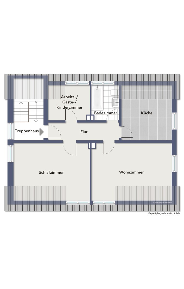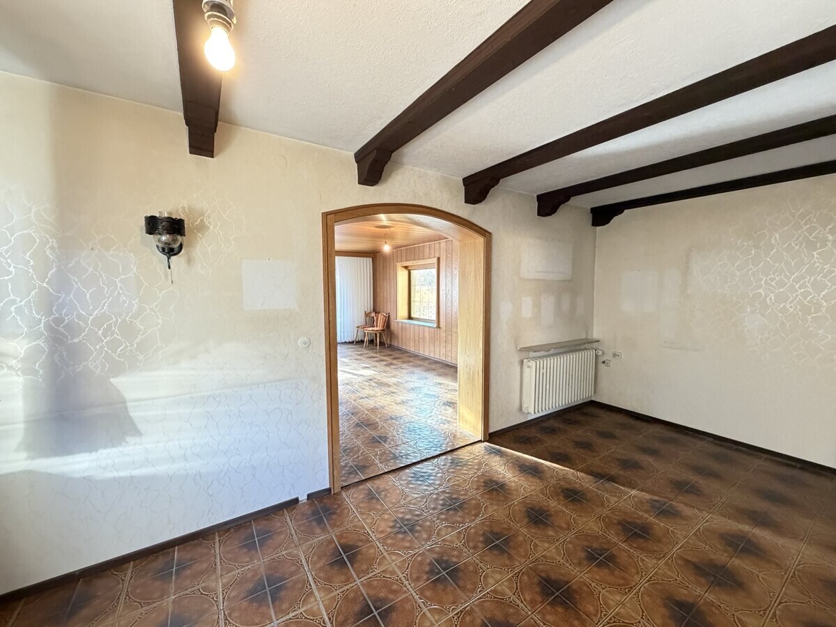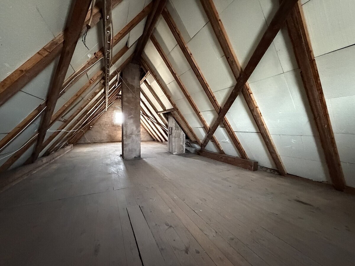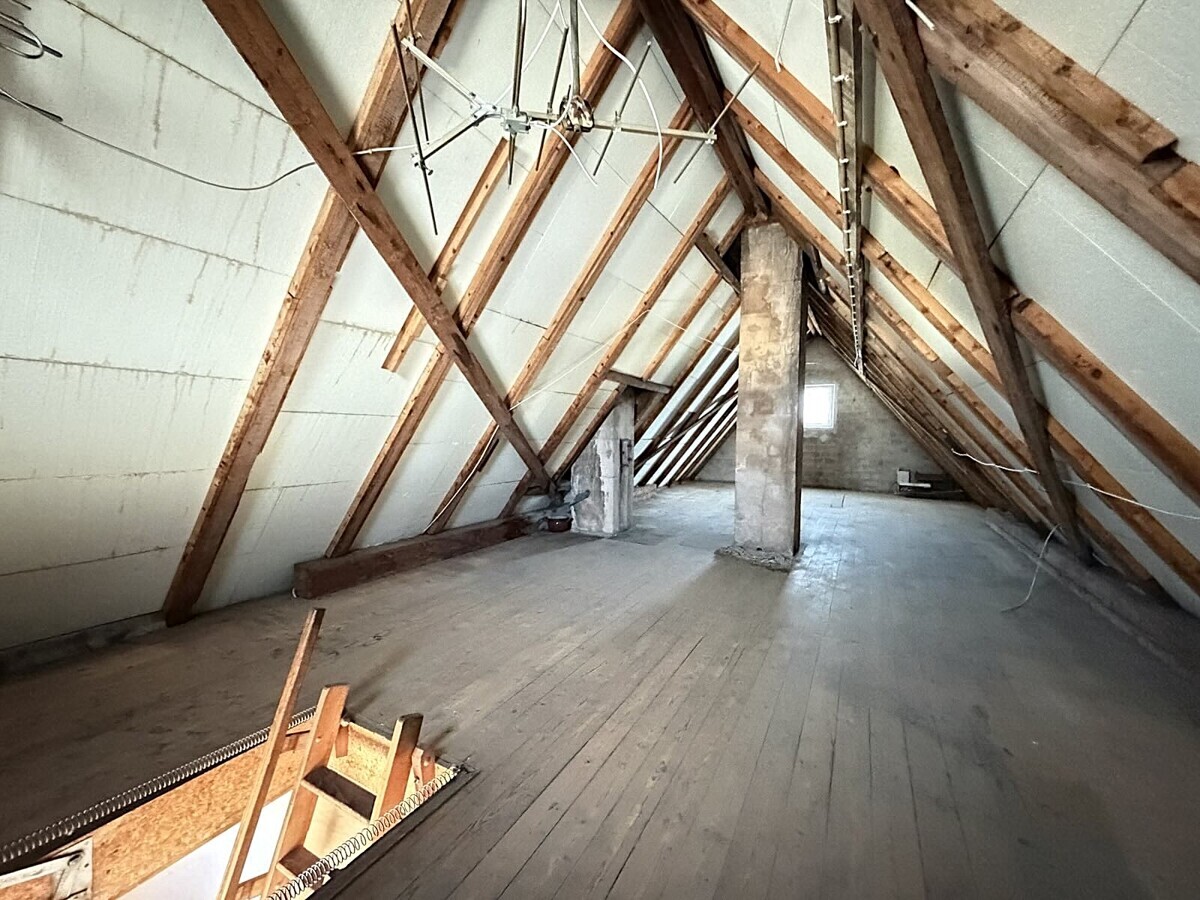Die Wohnung im Obergeschoss ist ähnlich geschnitten und bietet ebenfalls eine gut nutzbare Raumaufteilung. Hier ist ein Arbeits-, Gäste-, Kinderzimmer, Schlafzimmer, Wohnzimmer, Badezimmer und eine separate Küche vorhanden. Hier wurde gerade neuer Boden verlegt.