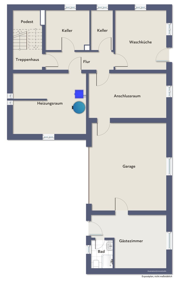 Das Kellergeschoss ist über das zentrale Treppenhaus erschlossen und bietet neben klassischen Abstell- und Lagerräumen zusätzliche Nutzflächen.