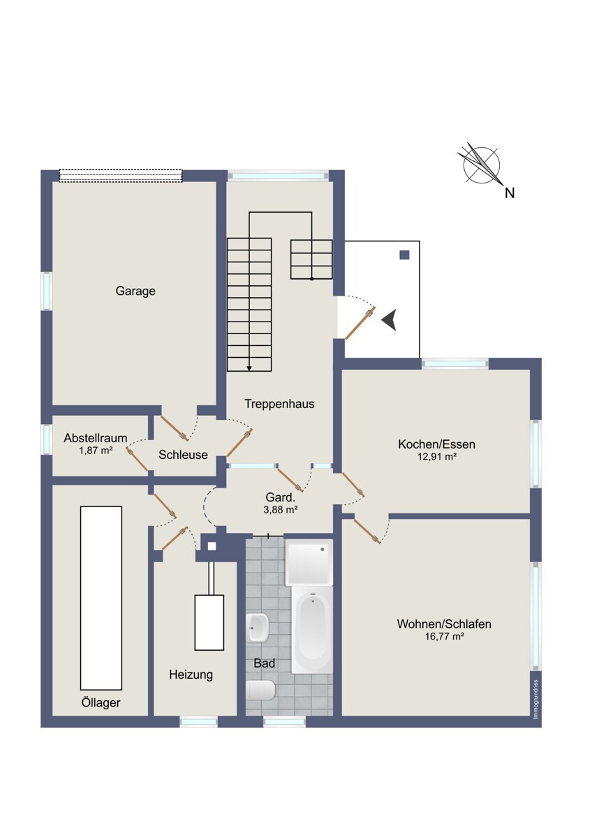 Einliegerwohnung im Erdgeschoss: ca. 41,98 m² Wohnfläche, aufgeteilt auf ein Zimmer, Badezimmer und Küche.