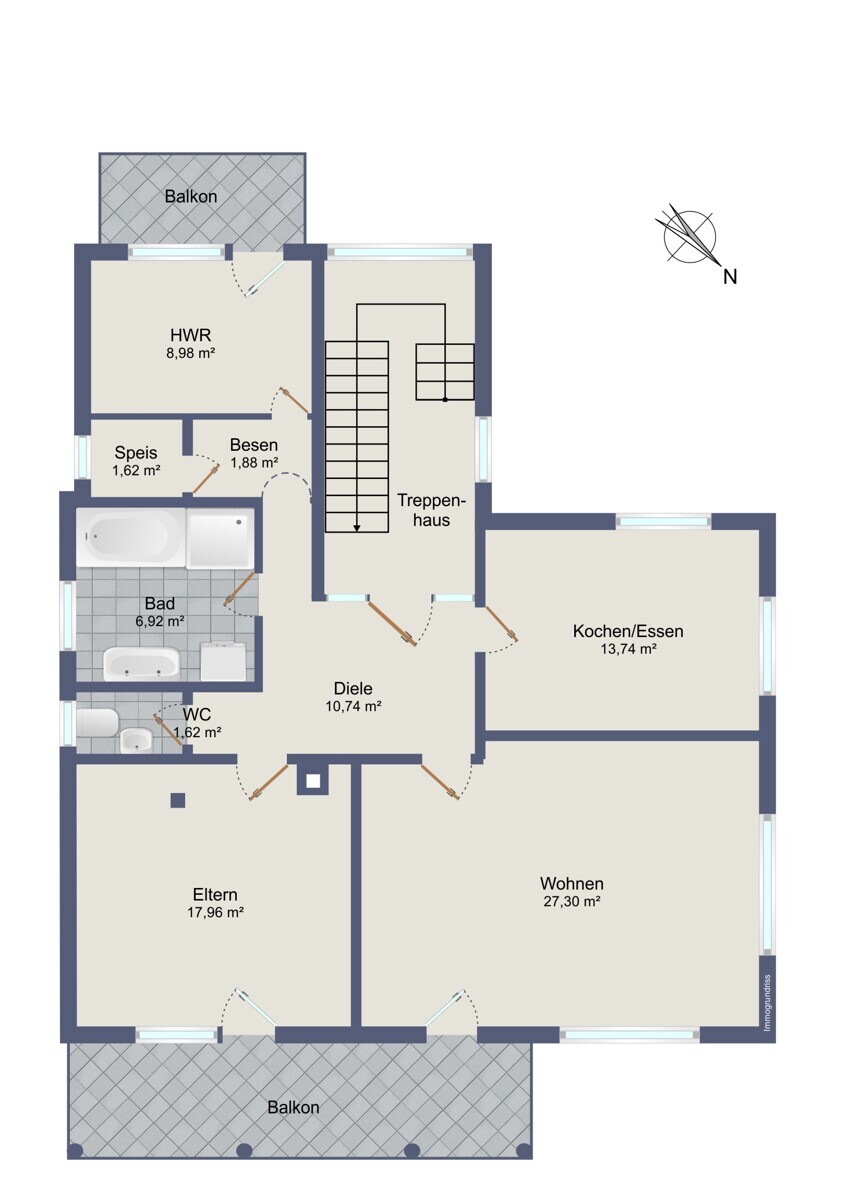 Wohnung im Obergeschoss: ca. 88,42 m² Wohnfläche mit 3 Zimmern, die ausreichend Platz für eine komfortable Wohnsituation bietet. Von dieser Etage aus besteht Zugang zu zwei Balkonen, die zum Entspannen im Freien einladen.