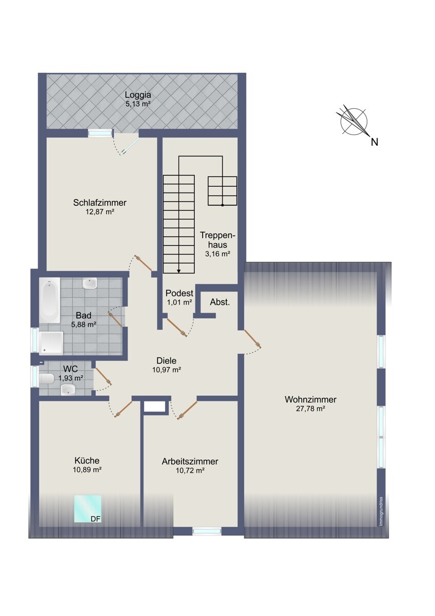 Wohnung im Dachgeschoss: ca. 86,17 m² Wohnfläche, ebenfalls mit 3 Zimmern. Hier befindet sich eine Loggia, die einen geschützten Außenbereich bietet und zusätzliche Aufenthaltsqualität schafft. Zusätzlich gibt es einen Zugang zum Spitzboden, der auch genutzt werden kann.