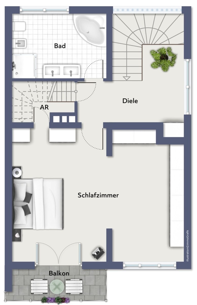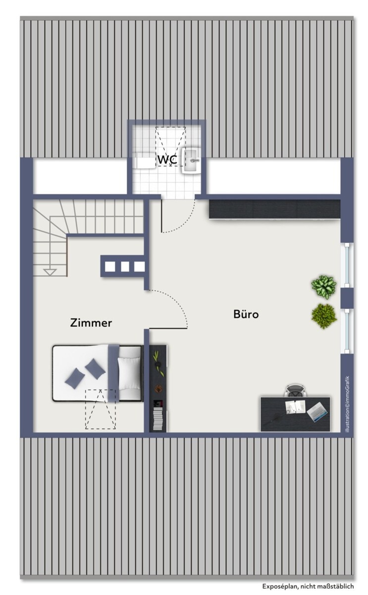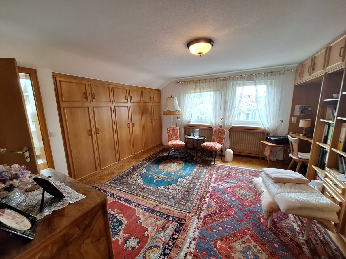 Im Obergeschoss stehen Ihnen ein Schlafzimmer mit Ankleidebereich, die Diele und das große Badezimmer zur Verfügung. Das Schlafzimmer mit Ankleidebereich wurde ursprünglich aus zwei separaten Zimmern zusammengelegt. Das Dachgeschoss bietet Ihnen ein weiteres Schlafzimmer, ein Büro und ein WC.