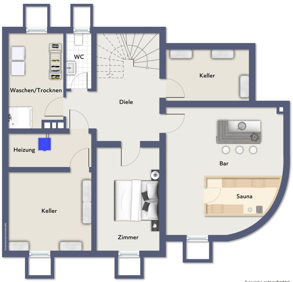 Im Keller haben wir zusätzlich ein Gästezimmer, einen Lagerraum, eine Bar, eine Sauna und den Heizungsraum. Ebenfalls ist im Keller eine Dusche und ein WC vorhanden.