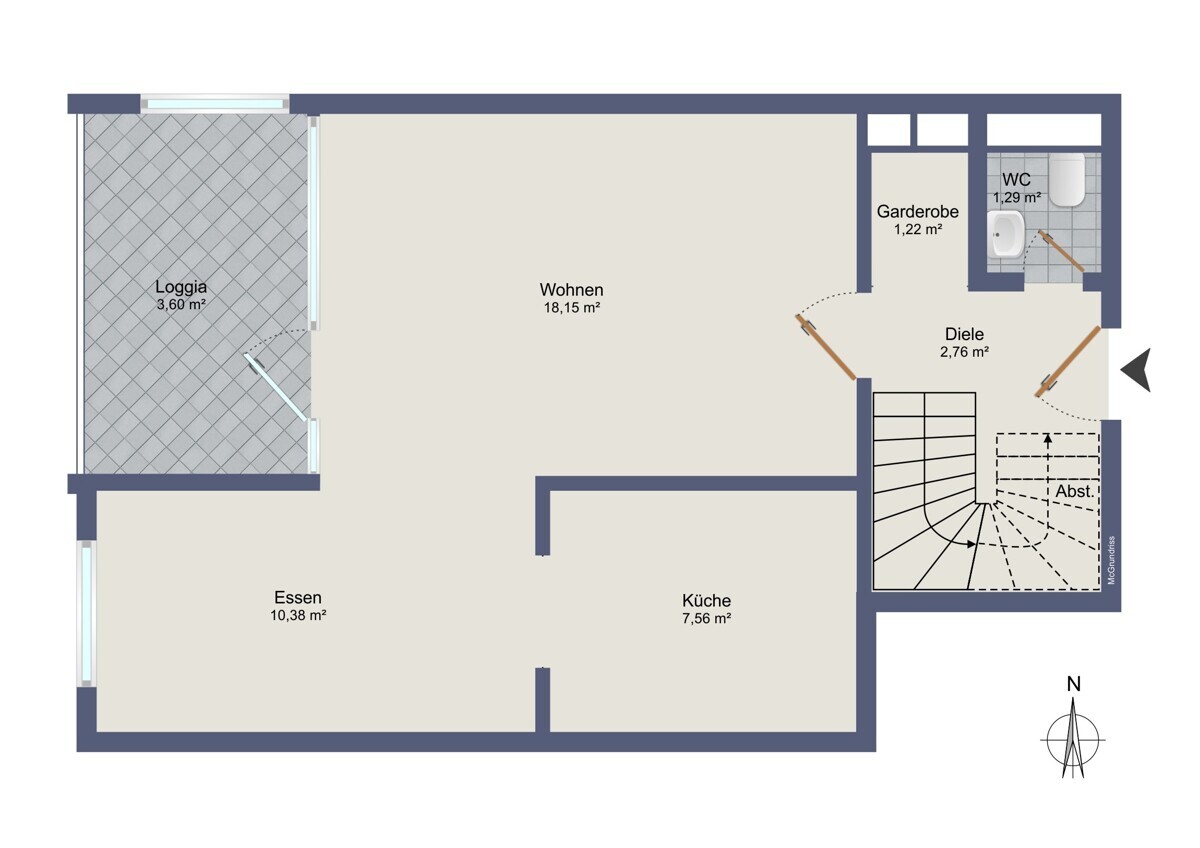 Im unteren Bereich der Wohnung erwartet Sie ein großzügig geschnittener Wohn- und Essbereich, der durch seine offene Gestaltung ein angenehmes Raumgefühl vermittelt und vielfältige Einrichtungsmöglichkeiten bietet. Von hier aus gelangen Sie auf die Loggia mit Westausrichtung, die insbesondere in den Nachmittags- und Abendstunden zum Verweilen im Freien einlädt. Ergänzt wird diese Ebene durch eine separate Küche, ein praktisches Gäste-WC sowie einen Abstellraum, der zusätzlichen Stauraum bietet.