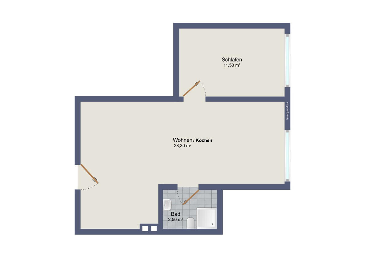 Der Grundriss bietet eine klare und funktionale Struktur: Vom Eingangsbereich aus gelangt man in den offen gestalteten Wohnbereich, der den Mittelpunkt der Wohnung bildet und Zugang zu den weiteren Räumen bietet. Das Schlafzimmer wurde vom Vormieter vom Wohnzimmer abgetrennt, wodurch ein separater und ruhiger Rückzugsort entstanden ist.